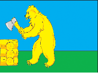 «Флаг представляет собой прямоугольное голубое полотнище с отношением ширины к длине 2:3, воспроизводящее фигуры герба: вдоль нижнего края зеленую полосу в 3/10, над ней посередине полотнища — медведя с топором, а вплотную к древку — сруб в три бревна, воспроизведенные желтым, черным и белым цветом».