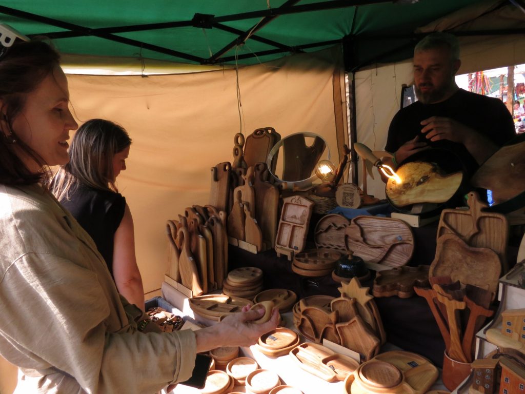 Впервые на фестивальной ярмарке участвовала семейная мастерская SloVEKA из Челябинска. Екатерина и Александр Слоновы уже несколько лет работают с деревом и приехали показать красоту изделий на своей выставке. По мнению Екатерины, на «Крутушке» царит особая атмосфера, интересная музыка и гости в этнических костюмах.